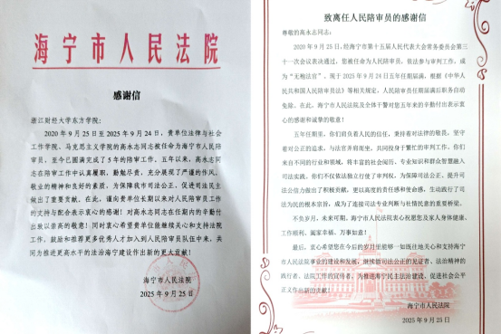 近日,海宁市人民法院向我院发来感谢信,对我院法律系副主任高永志老师在2020年9月25日至2025年9月24日担任人民陪审员期间的认真履职予以高度评价和诚挚感谢。五年来,高永志老师恪尽职守、勤勉尽责,以严谨的作风、高度的责任感和扎实的专业能力,积极参与各类案件的审理工作,为促进司法公正、增强司法民主作出了积极贡献。