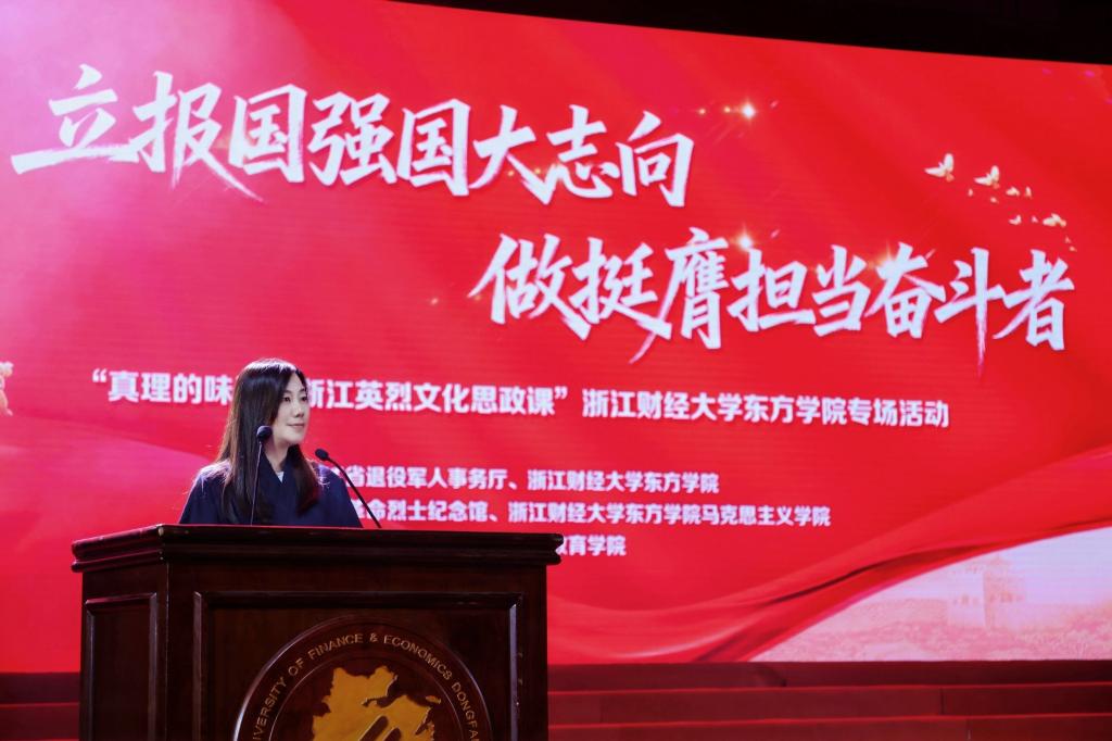 学院党委书记申屠莉致欢迎辞,她对浙江省退役军人事务厅与浙江革命烈土纪念馆多年来的支持表示衷心的感谢,并引导同学们在本场活动中思考如何用青春信仰回应时代召唤。她指出,抗战英雄们的故事不仅是值得代代传承的红色精神密码,更是大中小思政教育一体化建设中最鲜活、最珍贵的教材。申屠莉书记向各位同学提出三点希望:一是深植红色根脉,铸就信仰之魂,在与历史的深度对话中感悟英烈精神;二是勇立时代潮头,练就过硬本领,在青春时光中以勤学积蓄力量;三是投身伟大实践,书写奋斗华章,在知行合一中将个人理想融入国家发展。