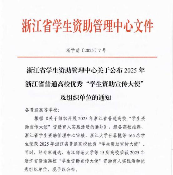 近日,浙江省学生资助管理中心正式公布2025年浙江省普通高校优秀“学生资助宣传大使”名单,我院法学专业刘佳玲同学在学院马羚老师的指导下凭借专业的政策解读能力、扎实的实践服务行动,从全省众多候选人中脱颖而出,成功获评省级优秀“学生资助宣传大使”荣誉称号,以法社学子的责任担当,搭建起资助政策与青年学子间的“暖心纽带”。